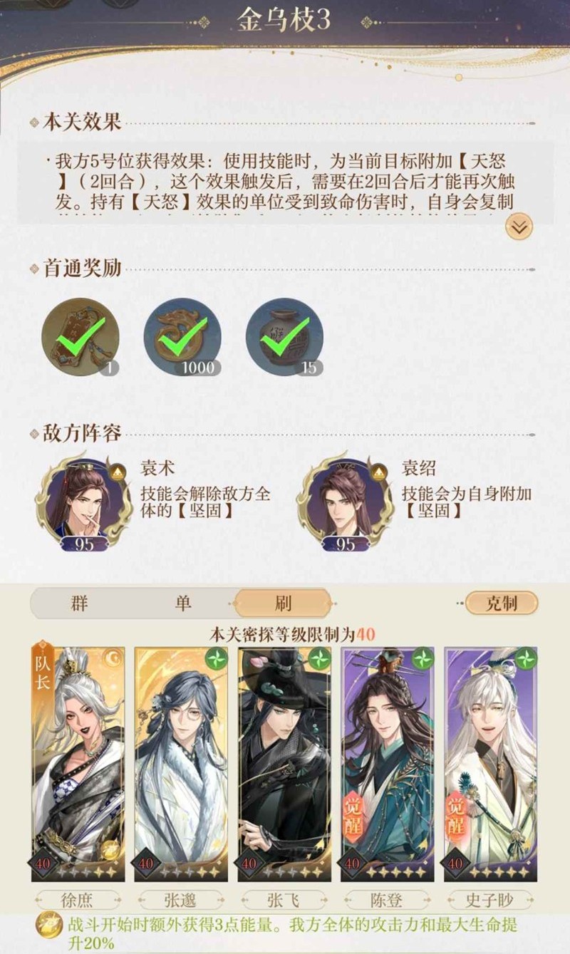 【参考配置】徐庶 2星 100+17 攻击7499生命30318 命盘敌少+谋无+剑气张邈 1星 90+15 攻击5896生命24449 命盘风强+攻击中+初始+3张飞 2星 90+14 攻击7099生命16893 命盘断桥+死战+普攻大陈登 觉醒 80+13 攻击4678生命26336 命盘能量+2+能量+1王粲 4星 90+15 攻击6534生命30857 命盘护盾+能量-1