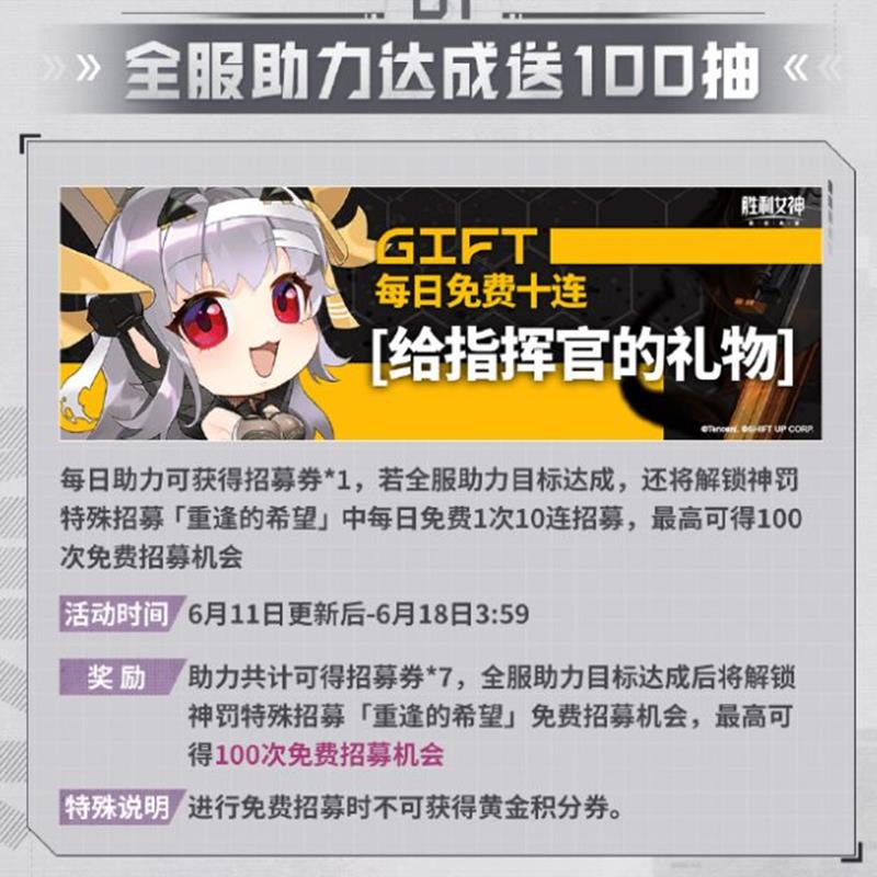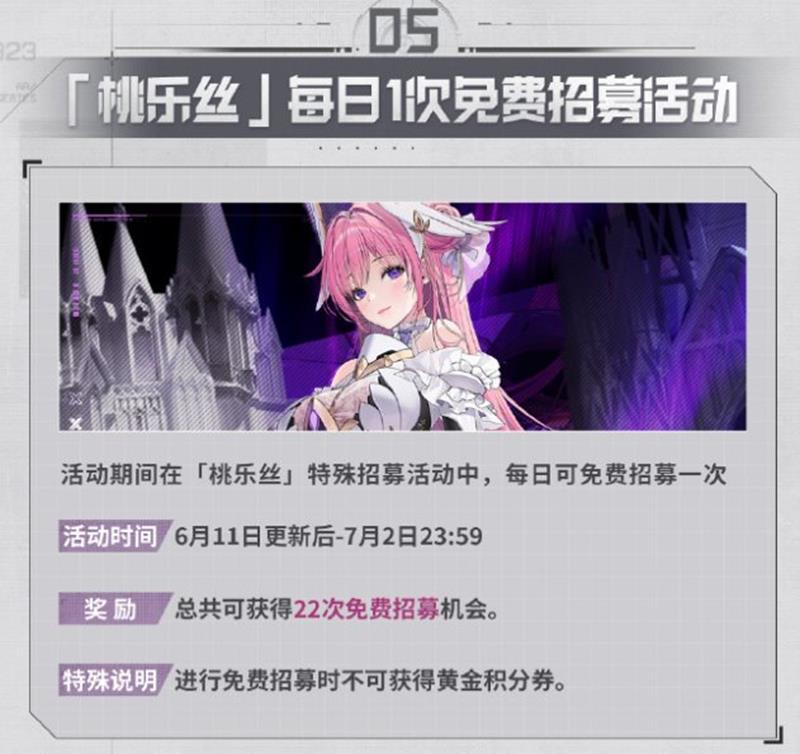 特殊招募活动:6月11日更新后至7月2日23:59,开启桃乐丝特殊招募。期间每日可免费招募一次,但无法获得黄金积分券。通过特殊招募可获得黄金积分券,收集200张可兑换角色桃乐丝。