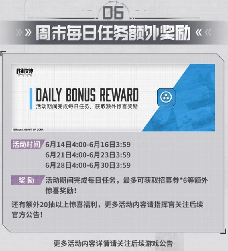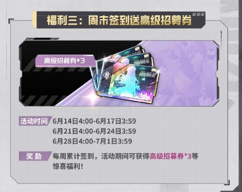 周末福利活动:6月14日4:00至7月1日3:59,每周周末登录游戏可获得SSR莱伊、高级招募券等福利。同时,周末期间拦截战、模拟室掉落道具双倍,完成每日任务还可额外获取招募券。