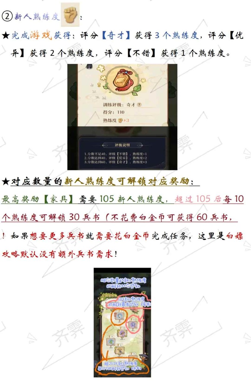想白嫖就需要尽量每局都达到评分【奇才】,提前找攻略,尽量完成找不同、打地鼠这类的简单游戏,答题游戏需要找到较全题库,如果没达到最高评分可以通过计算考虑是否要花费白金币。(超过105新人熟练度后每10个熟练度可解锁30兵书,此攻略不花费白金币可白嫖获得60兵书。想要更多兵书➽花白金币完成任务,这里是白嫖攻略默认没有额外兵书需求!