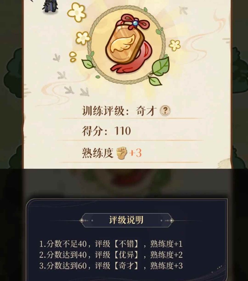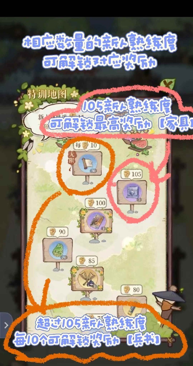 活动道具说明:招贤令:★通过完成特训任务获得,每天【登录+消耗120体力】可免费获得3个。★消耗1个招贤令可进入1次游戏。新人熟练度★完成游戏获得:评分【奇才】获得3个熟练度,评分【优异】获得2个熟练度,评分【不错】获得1个熟练度。★对应数量的新人熟练度可解锁对应奖励:最高奖励【家具】需要105新人熟练度,超过105后每10个熟练度可解锁30兵书(不花费白金币可获得60兵书