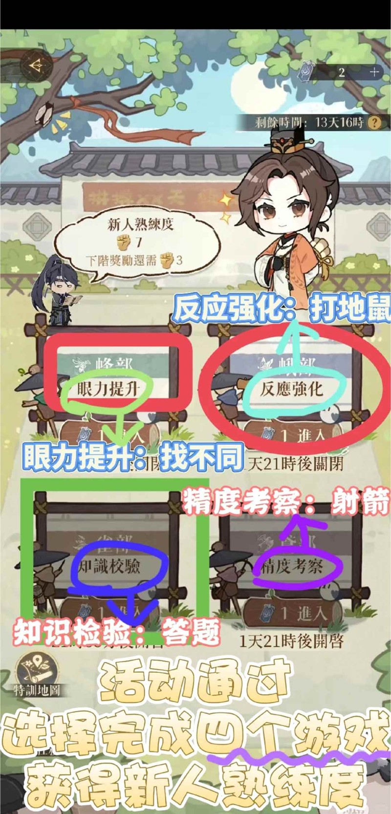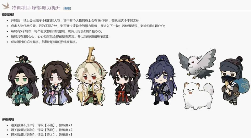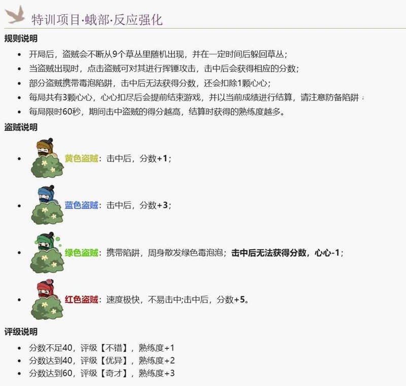 关于游戏(4种):★需要消耗招贤令进入,每个游戏开放时间不同,在相应时间完成简单游戏以获得【奇才】评分。1.蜂部眼力提升:看图找不同,期间可以切后台找攻略,此时时间会暂停,迅速看攻略,保证拿到【奇才评分】2.蛾部反应强化:打地鼠。较简单3.雀部知识校验:答题。题库庞大复杂,需要找攻略(主页会出题库)完成。4.鸢部精度考察:射箭。