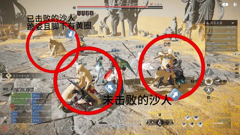 金杖顿地结束后,场上会出现3个小沙人黄圈,这时候所有人停手往3号点跑,将小沙人拉到3号点打(注意这时候田英的真气条要剩下20%或以下)打完小沙人且田英未气竭,承伤将田英拉回初始位置(即1号和2号点中间),在下一个机制前猛猛输出将田英打气竭气竭结束前一半时间,所有人分别到1、2号点站位,比如左列队伍站1点右列队伍站2点,这时候等点名两位玩家,两位玩家严格按照1、2号点站位(如果有重合的情况两位玩家自行调整到相应位置)