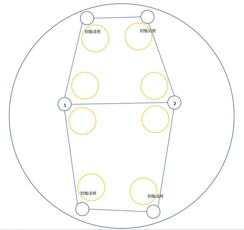 法杖落在1、2号点位后,所有人按p2黄圈所示站位,黄圈有一部分在法阵外没关系,但是人一定要站在法阵内接着所有人等黄圈满后按住防御或者吐火(如果血量在50%以下的一定要自己喝个药,开个无相金身保命)机制结束之后其他机制正常打法就行