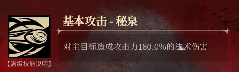 苍凛的基础攻击秘泉能够对主目标造成180%攻击力的法术伤害。发动技能时,法杖会发出幽蓝色的光芒锁定敌人,这个技能为苍凛提供了基本的输出手段。