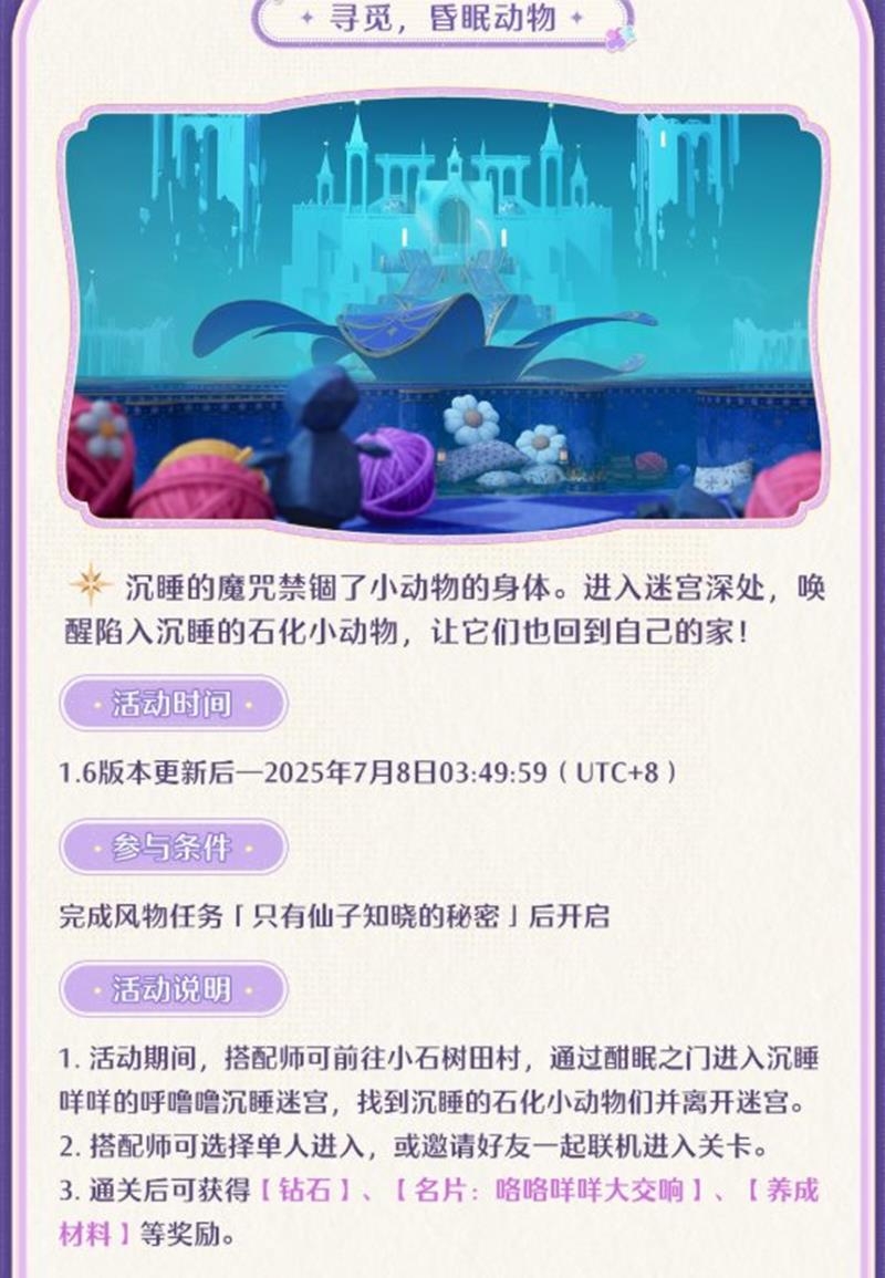 「寻觅,昏眠动物」系列关卡搭配师可通过酣眠之门进入沉睡咩咩的呼噜噜沉睡迷宫,找到沉睡的石化小动物们并离开迷宫。通关后可获得丰厚奖励!