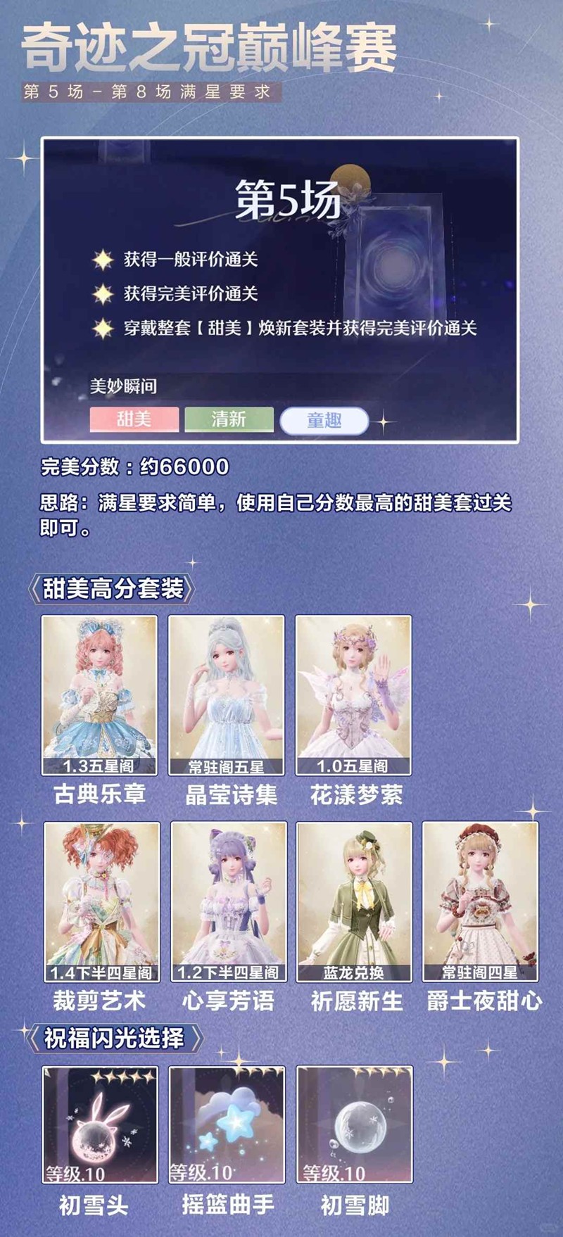 今日新一期巅峰赛已开启,给大家带来了后几场的搭配建议,此外有以下几点需注意:1. 1.5更新了新的祝福闪光,属性都不错,建议有体力优先刷取2. 尽量解锁图5中的技能点,再去打巅峰赛。> 第5场需要甜美套装焕新,需要的分数不高,可以一键无痛过