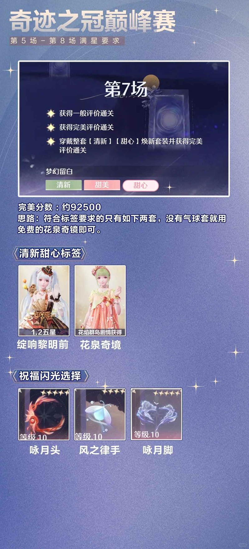> 第6场符合标签的套装有【晓雾之誓】与【定格瞬间】,没有的话可以选择如图散件凑标签要求> 第7场如果没有气球套,焕新能力套装【花泉奇境】也能过关
