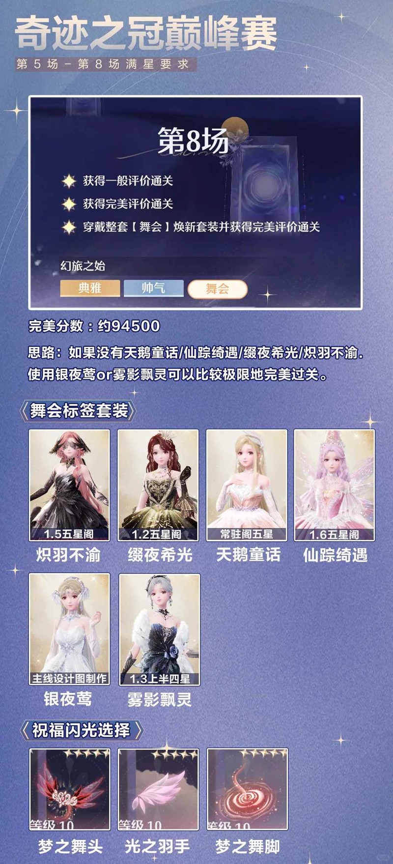 > 第8场符合标签的套装比较多,都是五星大裙子。如果一件都没有的话,可以选择银夜莺搭配手持物“不息之蕾”,可以极限完美。