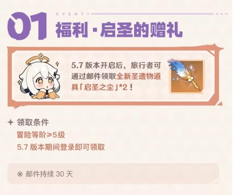 很多小伙伴都在关心原神5.7版本有哪些活动?福利有哪些?下面为大家带来 5.7版本活动大全,希望可以帮知道您。福利·启圣的赠礼