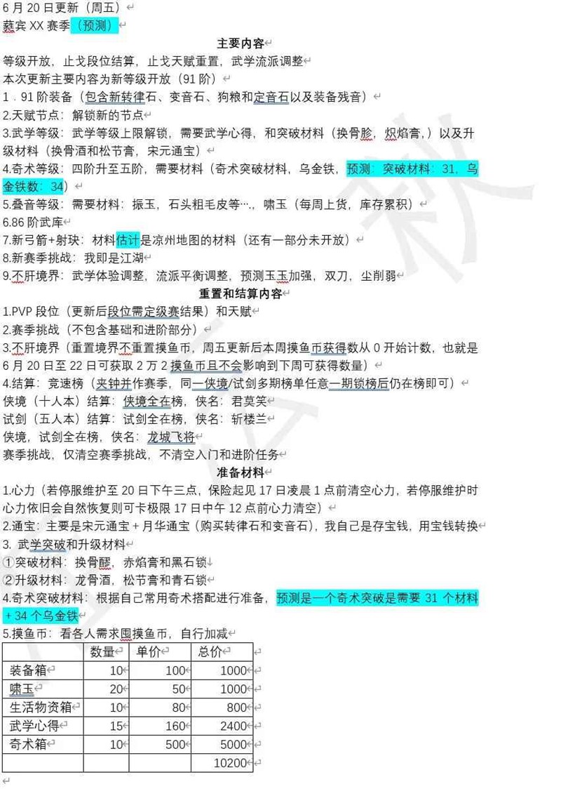 ②赛季挑战,仅清空赛季挑战,不清空入门和进阶任务准备材料1.心力(保险起见17日凌晨1点前清空心力)2.通宝:主要是宋元通宝+月华通宝(购买转律石和变音石),我自己是存宝钱,通宝不够就用宝钱转换3. 武学突破和升级材料换骨醪,赤焰膏,黑石锁,龙骨酒,松节膏,青石锁4.奇术突破材料:根据自己常用奇术搭配进行准备5.摸鱼币:看各人需求囤摸鱼币,图三里面的表格大概算了一下囤多少合适(一更新就能买买买)