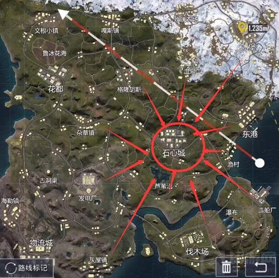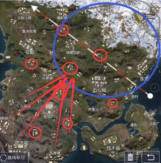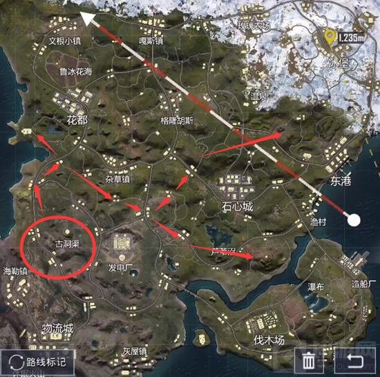 首先,物资点分布是玩家需要考虑的关键因素。物资丰富的地点(红圈)通常也是敌人密集的区域,因此不建议将其作为首选降落点。相反,选择物资刷新中等的地点(蓝圈),如古洞渠,可以避免初期的激烈冲突,并允许玩家快速搜集资源。