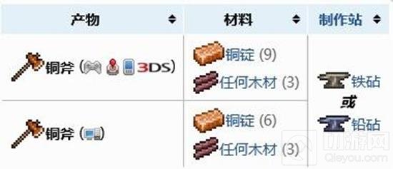 合成铜斧:在铁砧或铅砧处,将9个铜锭和3个木材放入合成栏,即可制作出铜斧。