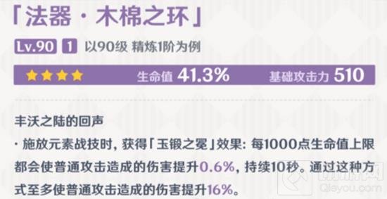此外,“法器·木棉之环”在生命值加成方面也有不俗的表现。在满级时,提供41.3%的生命值加成。这不仅增强了角色的生存能力,也进一步放大了其生命转普攻增伤的效果,使得角色在保持生存的同时,也能持续输出高额伤害。