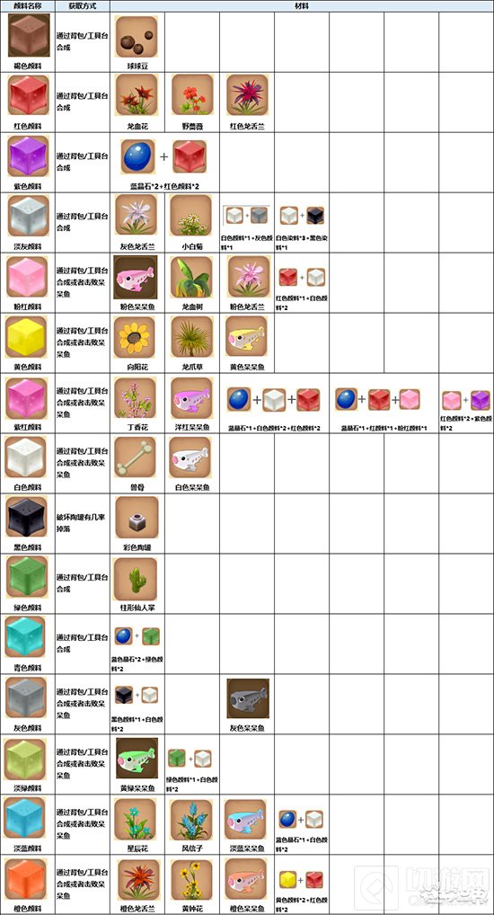 接下来,我们来看看如何获取颜料。颜料可以通过在背包或工具箱中分解特定的原材料来获得。以下是一些常见颜料及其对应的原材料: