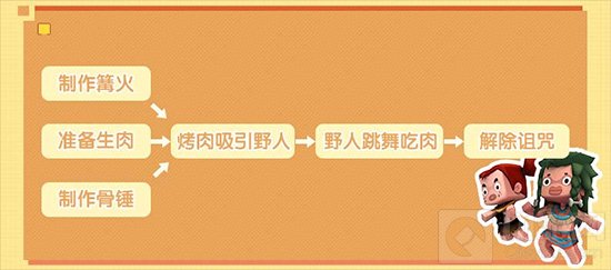 野人在吃完烤肉后会入睡,这时就是使用另一个新道具——巫术骨锤的时机了。制作巫术骨锤需要兽骨、向阳花和荧光晶体。使用巫术骨锤点击睡着的野人,就能打掉他们的面具并驱散诅咒。