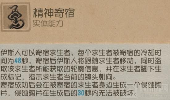 附身求生者:精神体可以附身求生者,生成陶片,增加侵蚀度,监管者可以选择陶片处进行传送。