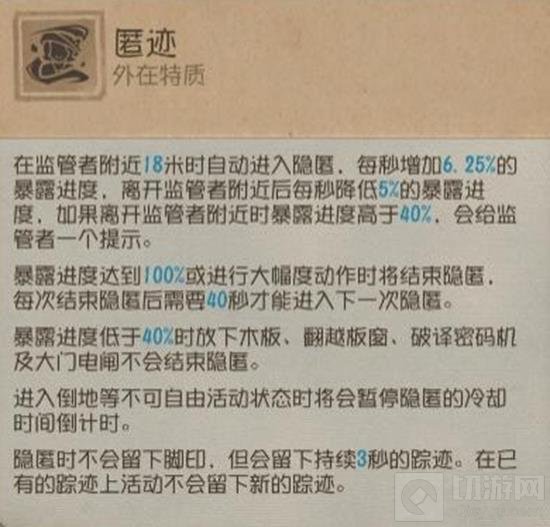 每次结束匿迹状态有40秒的冷却时间(当进入倒地等不可自由活动状态时,匿迹冷却倒计时会暂停)。