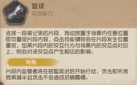 宣读行为有1秒延迟,需预判求生者走位,可指定区域宣读,但无实体模型,不能卡位,宣读的求生者盖板不能眩晕监管者,挽留前记录的攻击片段,不会因挽留增加伤害。