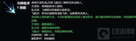 投掷长枪攻击敌人,拾取长枪获得斗志,使下一次武器攻击造成额外感电伤害。斗志满层时,技能可激发雷动状态,攻击附带连锁感电伤害。
