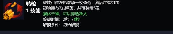 一技能-转枪:旋转祖传左轮装填一枚弹药,然后连续射击。初始拥有2发弹药,共可装填5发,强化子弹可以穿透敌人。