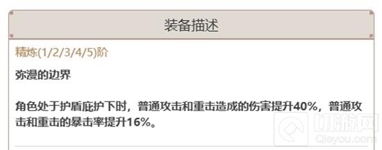 武器在满级时的属性为:攻击力564,副属性增加27.6%的攻击力,满精炼的武器属性:角色处于护盾庇护下时,普通攻击和重击造成的伤害提升40%,普通攻击和重击的暴击率提升16%。