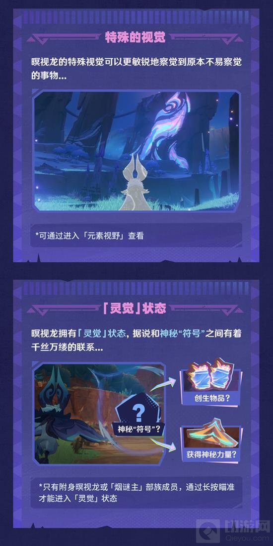 灵觉状态:暝视龙拥有「灵觉」状态,与神秘“符号”之间有着千丝万缕的联系。通过进入「元素视野」,可以看到「灵觉」状态。