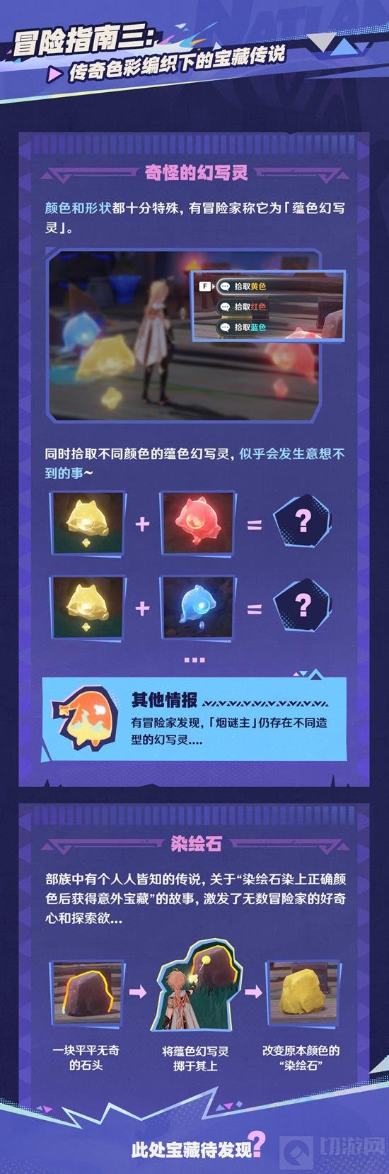 蕴色幻写灵:颜色和形状都十分特殊,有冒险家称其为「蕴色幻写灵」。拾取不同颜色的幻写灵,可能会发生意想不到的事情。