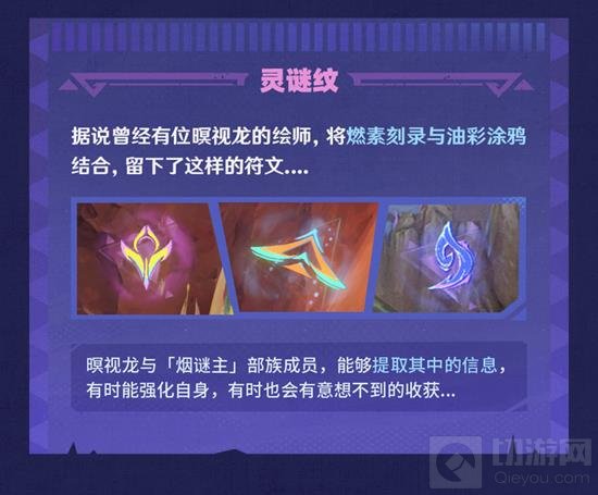 灵谜纹:据说有位暝视龙的绘师将燃素刻录与油彩涂鸦结合,留下了这些符文。烟谜主和暝视龙能够提取其中的信息,有时能强化自身,有时会有意想不到的收获。