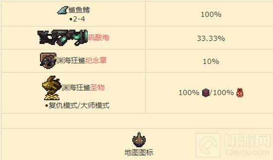 渊海狂鲨的掉落物品包括钱币、鲨鱼鳍(2-4个)、硫酸炮(33.33%的掉率)和渊海狂鲨纪念章(10%的掉率)。在复仇模式或大师模式下,还会掉落渊海狂鲨圣物。