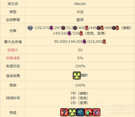 渊海狂鲨,英文名为Mauler,属于水生生物群落,主要在酸雨环境中活动。它的伤害输出从135到469不等,具体数值取决于玩家的游戏难度。渊海狂鲨的最大生命值在90,000到216,000之间,具有50点的防御力和5%的伤害减免。它对击退效果具有100%的抗性,并能造成辐射效果,持续时间从1秒到7秒不等。
