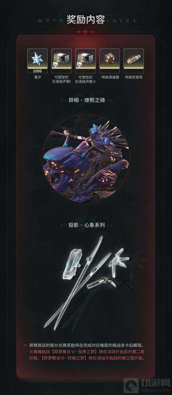 本次活动中,玩家将面对全新的挑战和敌人。通过完成指定任务和挑战,可以获得丰厚的奖励,包括星声、巨浪级声骸、特级调谐器等珍贵道具。此外,还有机会获得异相·燎照之骑和投影·心象系列的特殊奖励。