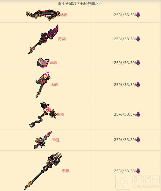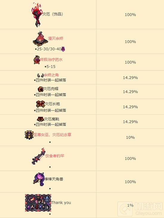 物品:至少会掉以下七种武器之一,灾厄(饰品),湮灭余烬,终极治疗药水,余烬之角,灾厄兜帽,灾厄长袍,灾厄魔靴,至尊女巫,灾厄纪念章,饮食者钓竿,棒棒天角兽,Thank you,灾厄(传颂之物),万物的焦点(传颂之物),宝藏保险箱(至尊女巫,灾厄),硫火宝珠,利维,盖尔大剑,至尊女巫,灾厄圣物。