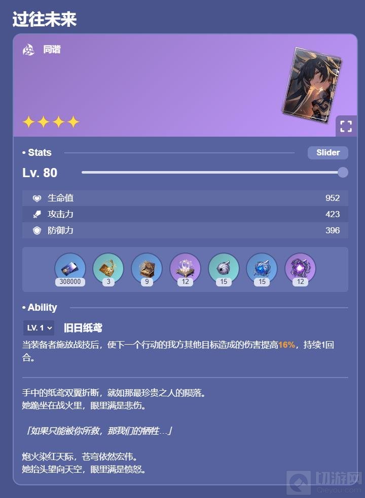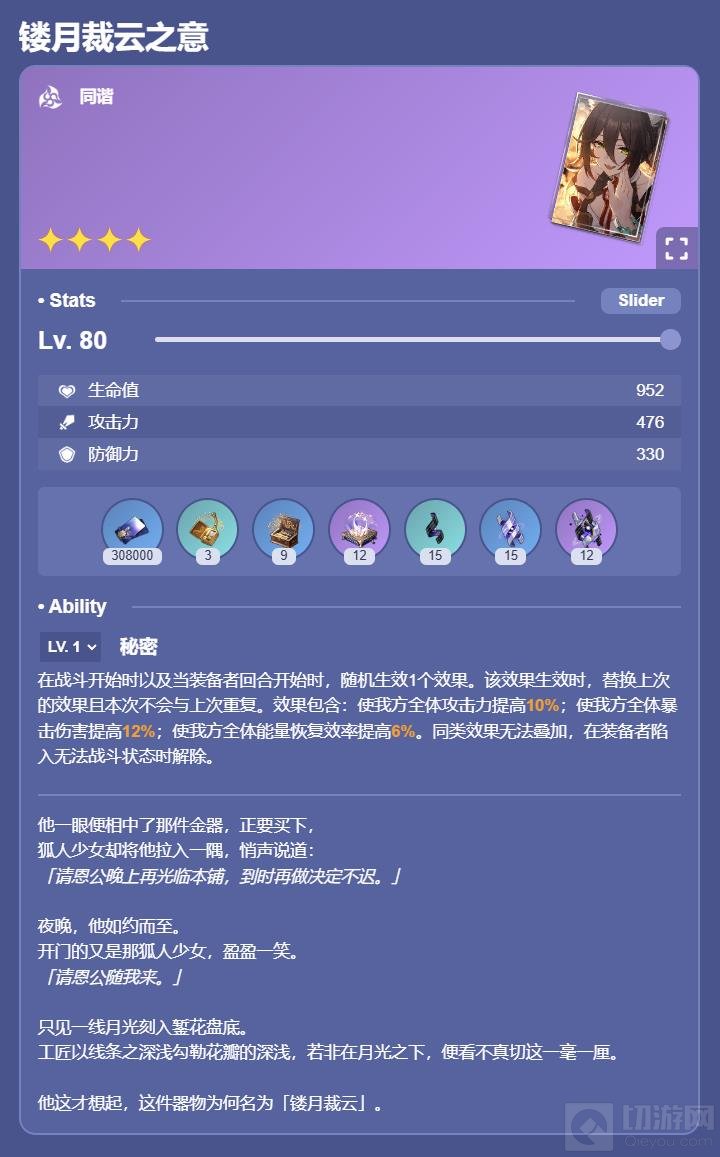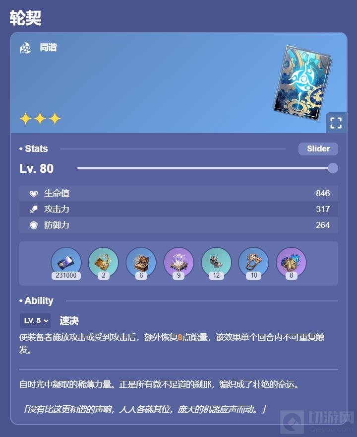 效果:当装备者对我方单体角色施放战技或终结技后,装备者恢复6点能量,同时使技能目标获得1层【圣咏】,持续3回合,最多叠加3层。每层【圣咏】使持有者造成的伤害提高15%。装备者每对我方单体角色施放2次战技或终结技后,恢复1个战技点。