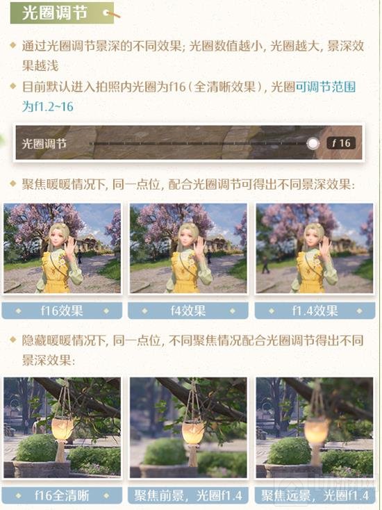 光圈大小直接影响景深效果。光圈数值越小,光圈孔径越大,景深越浅。游戏默认光圈为f16,提供全清晰效果,玩家可以调节光圈从f1.2至f16,以获得不同的景深效果。例如,f16提供全清晰效果,而f4和f1.4则会产生不同的景深效果,特别是在聚焦暖暖或隐藏暖暖时。