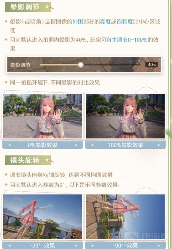 晕影,或称暗角,指的是图像边缘的亮度或饱和度低于中心区域的现象。游戏默认晕影设置为40%,玩家可以调节0%至100%的效果,以获得不同的视觉效果。例如,0%的晕影效果与100%的晕影效果对比鲜明。