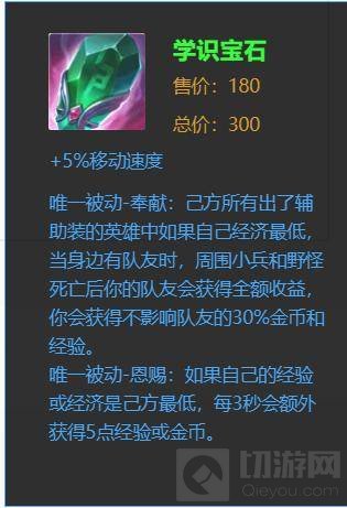 瑶作为一个辅助,不能和队友抢经济,所以第一件要出的装备是学识宝石,也就是小辅助装,到中期可以根据需求在升级为大辅助装。