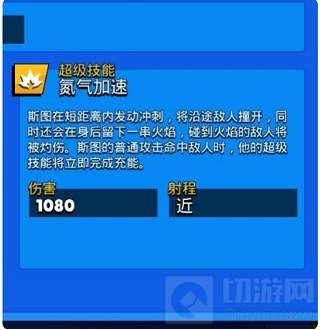 2、这个英雄的核心玩法就是超级技能,斯图普攻只要打到敌人一下,即可完成超级技能充能。值得注意的是,斯图超级技能冲刺范围实际比指示器范围还要大一点,由于这个英雄的超级技能带有击退效果,在足球模式是最佳人选,别人拿球你直接超级技能击退来进行抢球,没有星徽冲刺距离大概为两格。