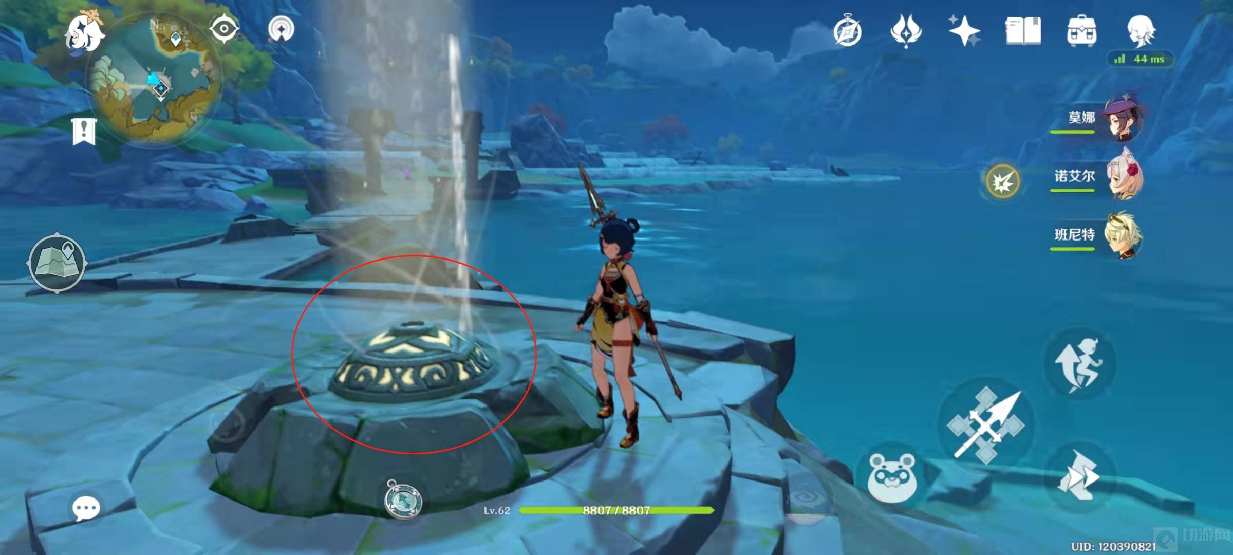 1.平台上的六个火元素方碑是被锁上的无法激活,这时我们在华清归藏密宫的平台上附近找到一个圆形的装置,点击启动。