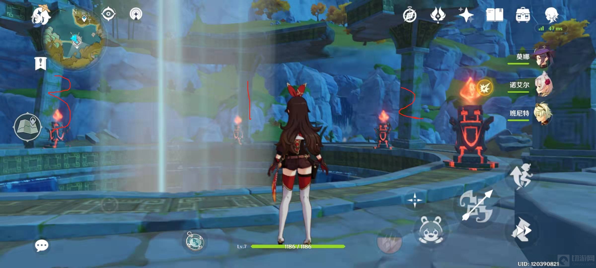 2.平台上可见六个火元素方碑,每个方碑后面都有一根柱子。其中有三个柱子比较长,依次激活三个长柱子所对应的火元素方碑就行了。