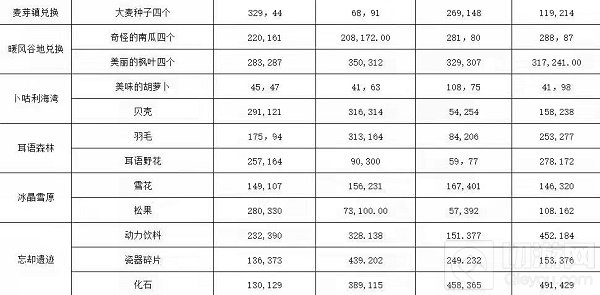 目前只有六个地区的材料兑换表,每个坐标对应的材料都不一样,玩家可以参考下表,根据自己的需求去城镇的坐标处兑换材料。
