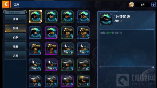 决定玩家游戏发展进程的关键因素是时间,通过加速类道具的使用,可以快速提升玩家的游玩进度,其中加速类道具,分为专项加速道具和通用加速道具,新手玩家在这要注意的一点是我们能获得加速的途径不是很多,除了常规的游戏内活动以及联盟宝箱外,基本只能通过购买礼包获得,所以我们尽量要精打细算,比如还剩三分四十秒建好的建筑就不要急着用五分钟的加速来完成,尽量先让联盟中的小伙伴点满帮助,这样能最大限度的减少进度时间,然后再用加速进行完成。