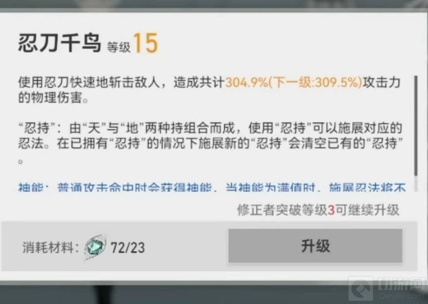 1、首先是了解觅影的技能,普攻:忍刀千鸟,使用忍刀快速地斩击敌人,造成共计306.9%攻击力的伤害。<忍持>:由<天>与<地>两种持组合而成,使用<忍持>可以施展对应的忍法。在已拥有<忍持>的情况下施展新的<忍持>会清空已有的<忍持>。