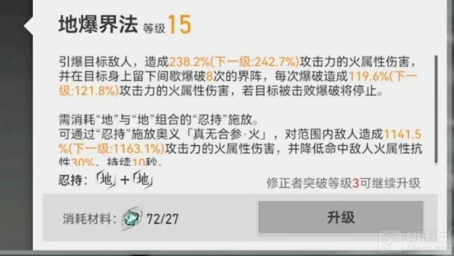 5、奥义:地爆界法,引爆目标敌人,造成247.5%攻击力的火属性伤害,并在目标上留下间歇爆破8次的界阵,每次爆破造成124.3%攻击力的火属性伤害。如目标死亡爆破将停止,需消耗<地>与<地>组合的<忍持>释放。