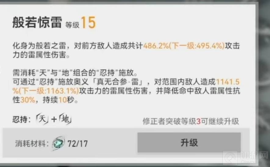 3、技能二:般若惊雷,化身为般若之雷,对前方敌人造成共计654.6%攻击力的雷属性伤害。需消耗<天>与<地>组合的<忍持>释放。