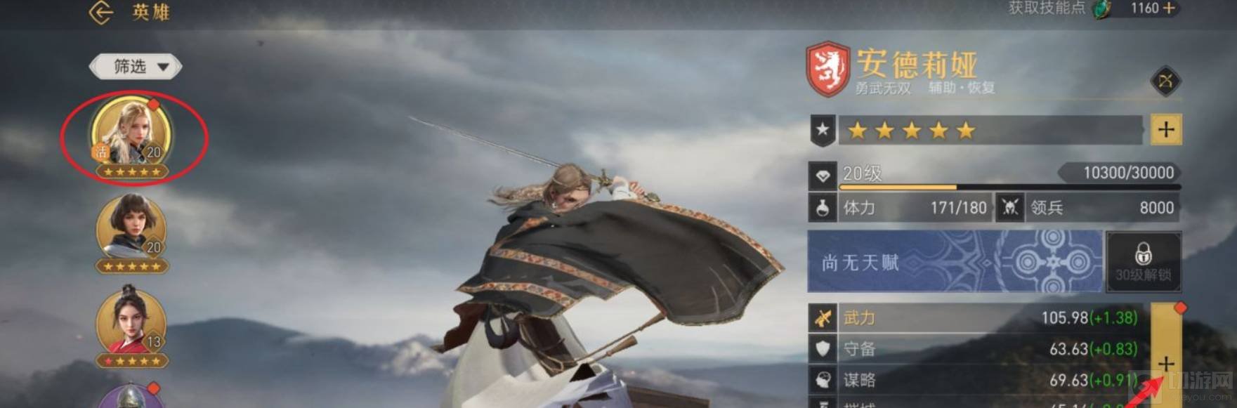 2、选择加点英雄安德莉亚,选好后点击右侧的加号,优先选择武力加点,接下来依照顺序选择:谋略,守备,摧城。加完点后保存就可以了。