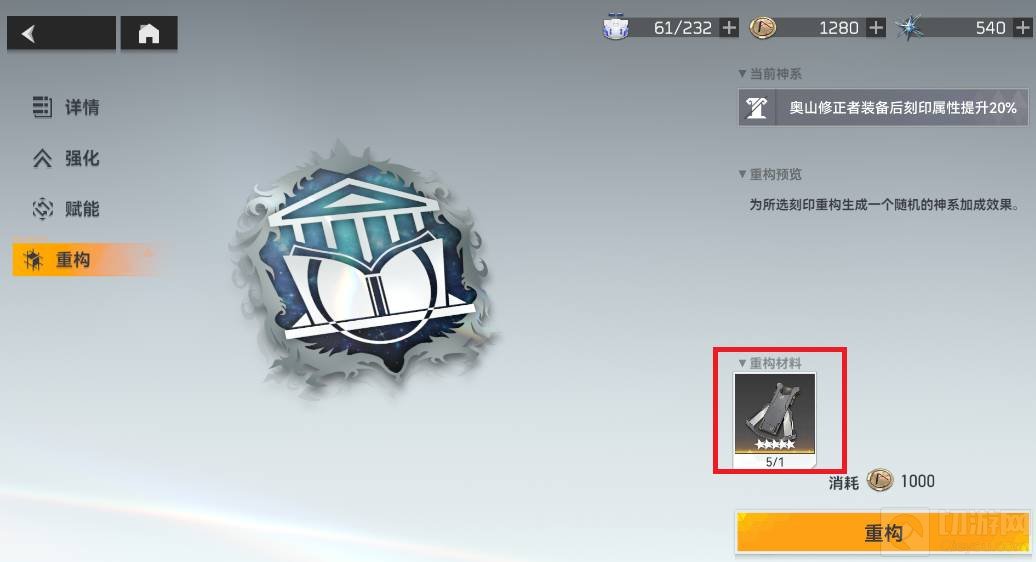 1、重构秘仪使用:在刻印培养界面,可以点击“重构”选项,通过消耗一个“重构秘仪”道具将一个五星的刻印进行重构。