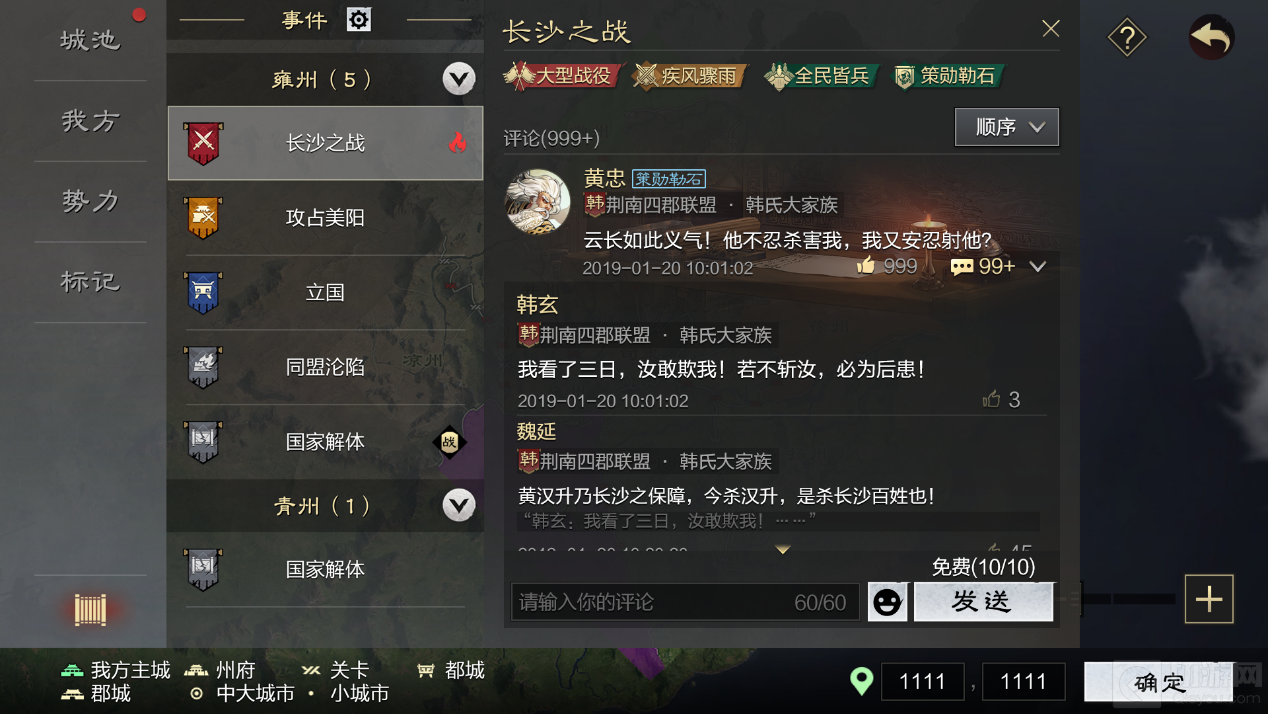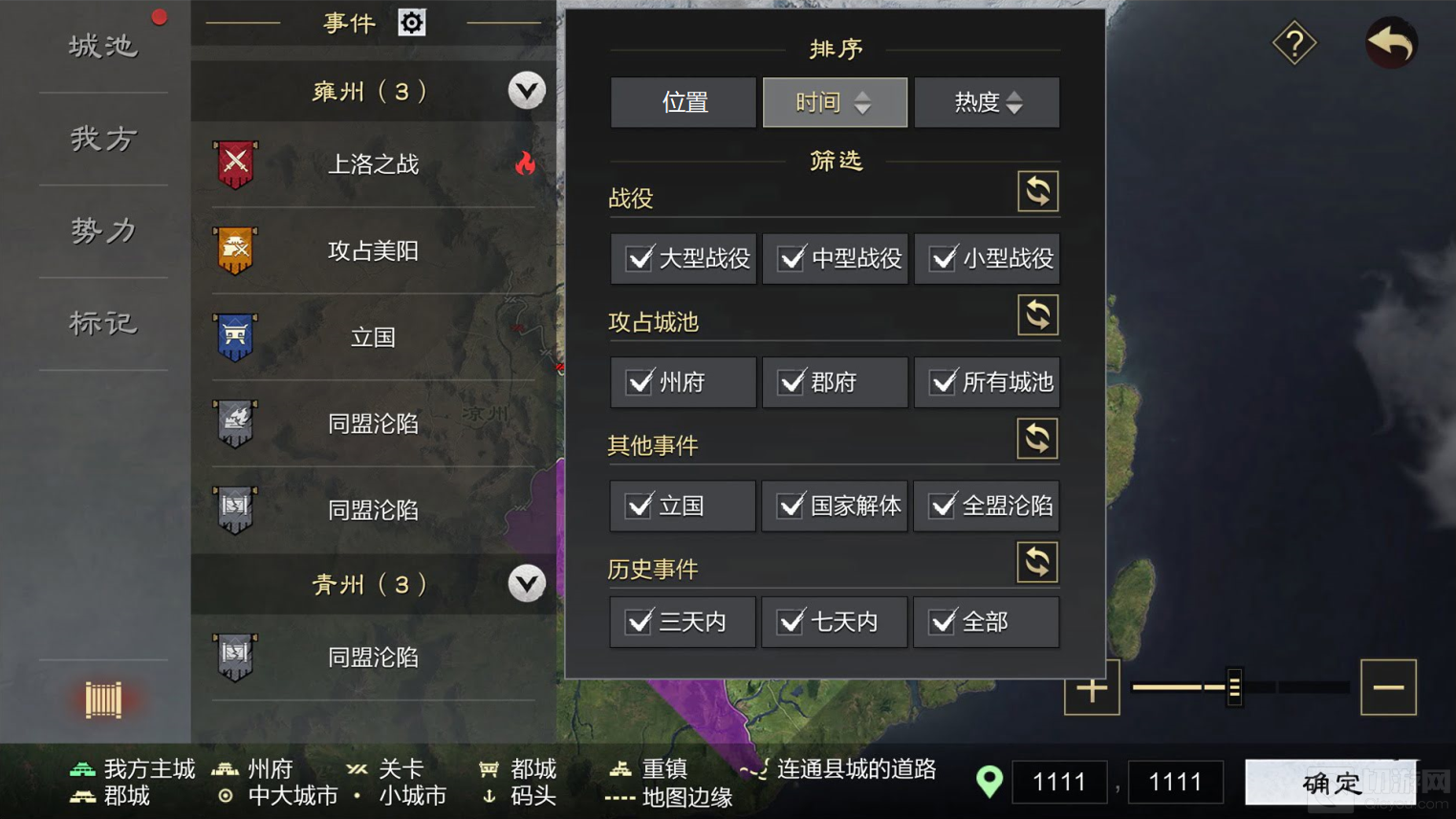 事件可以按所在位置、发生时间和热度高低进行排序,主公们可自由选择事件的排序方式和筛选规则,甚至可以查看已经结束的事件,翻阅各位主公们在历史事件中留下的精彩评论。