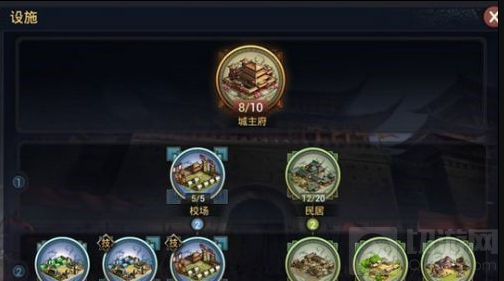 点击主城,并在右下角点击“设施”,就可以进入游戏的科技树系统。军事与城市建设这两大分支玩家可以根据需要着重发展其中一支,也可以并行发展。而且科技树系统以城主府等级为核心,相关科技需要城主府达到一定等级才可以研究并升级,如提高城区耐久度的科技“城墙”需要城主府达到四级才可建造。