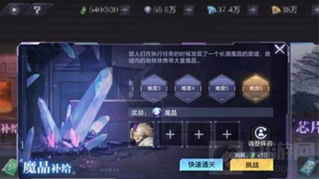 玩家可以在玩法中找到资源补给,选择魔晶补给,然后点击进行挑战。